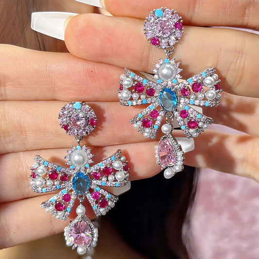 High quality AAA premium bow colored diamond earrings Material: 5A grade cubic zirconia gemstone/rhodium-plated copper/artificial...