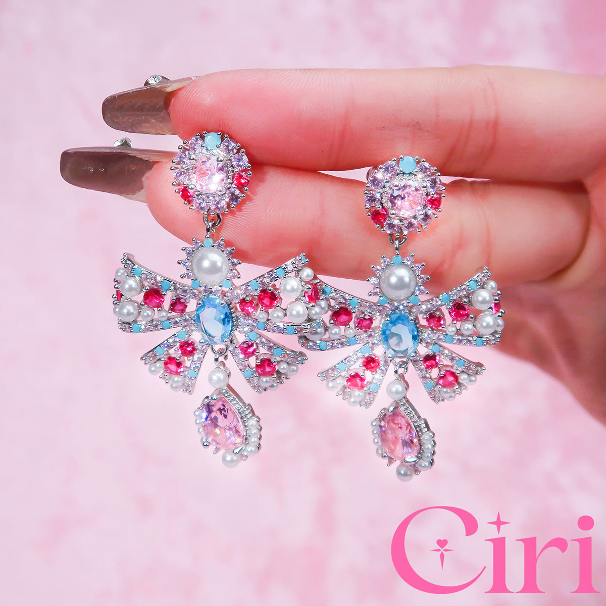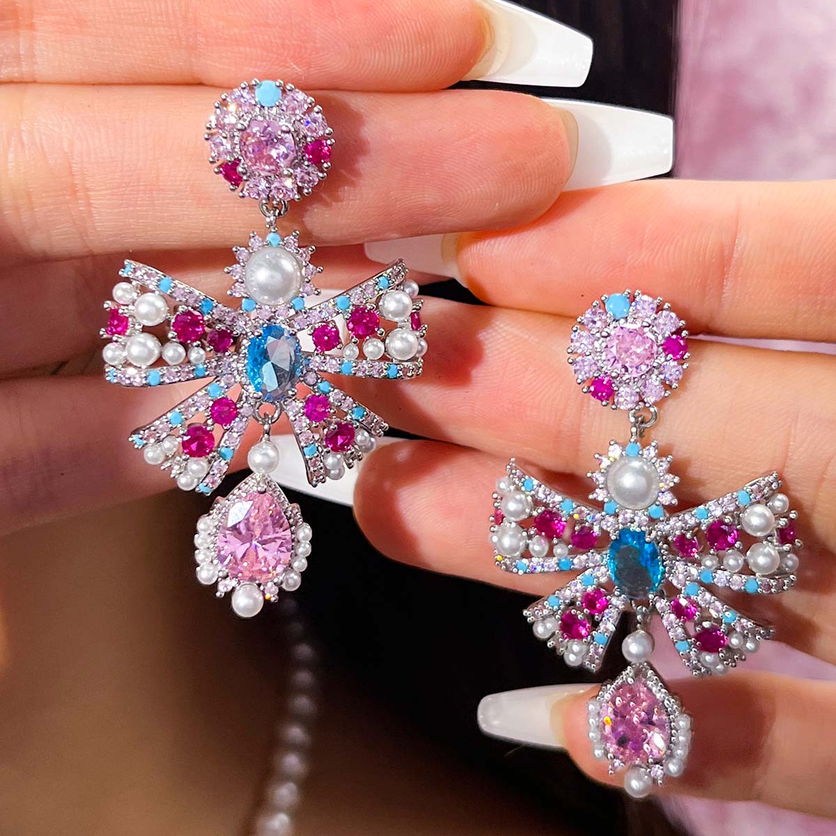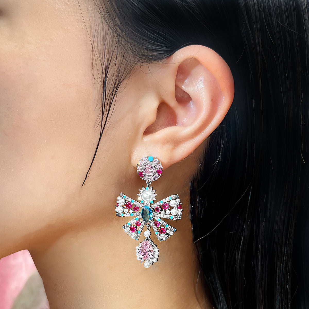 - Shape: Baroque style bow earrings, composed of pink zircons, pearls and aquamarine stones, perfect for parties and dinners.