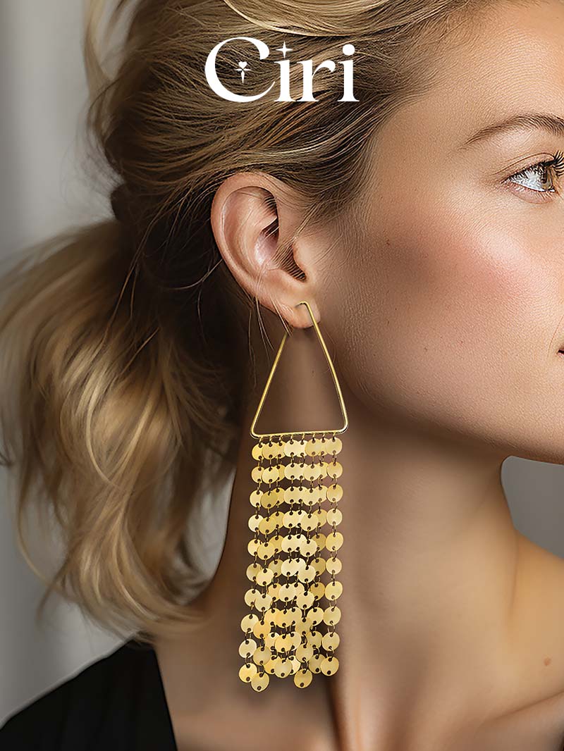 - Shape: This is a dazzling gold triangular sequin tassel earring. The tassel of the earring is made of multiple shiny sequins, which can reflect light from different angles, adding layering and fashion sense.