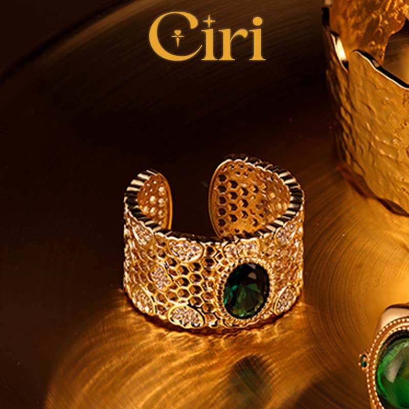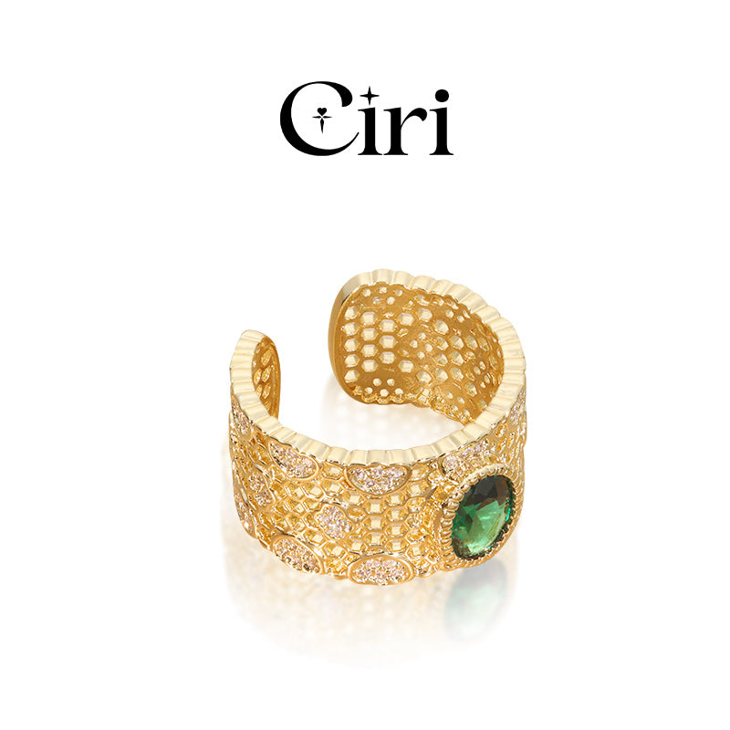 - Shape: The shank of this ring is composed of lace cutouts and diamonds with a green faux stone in the center.