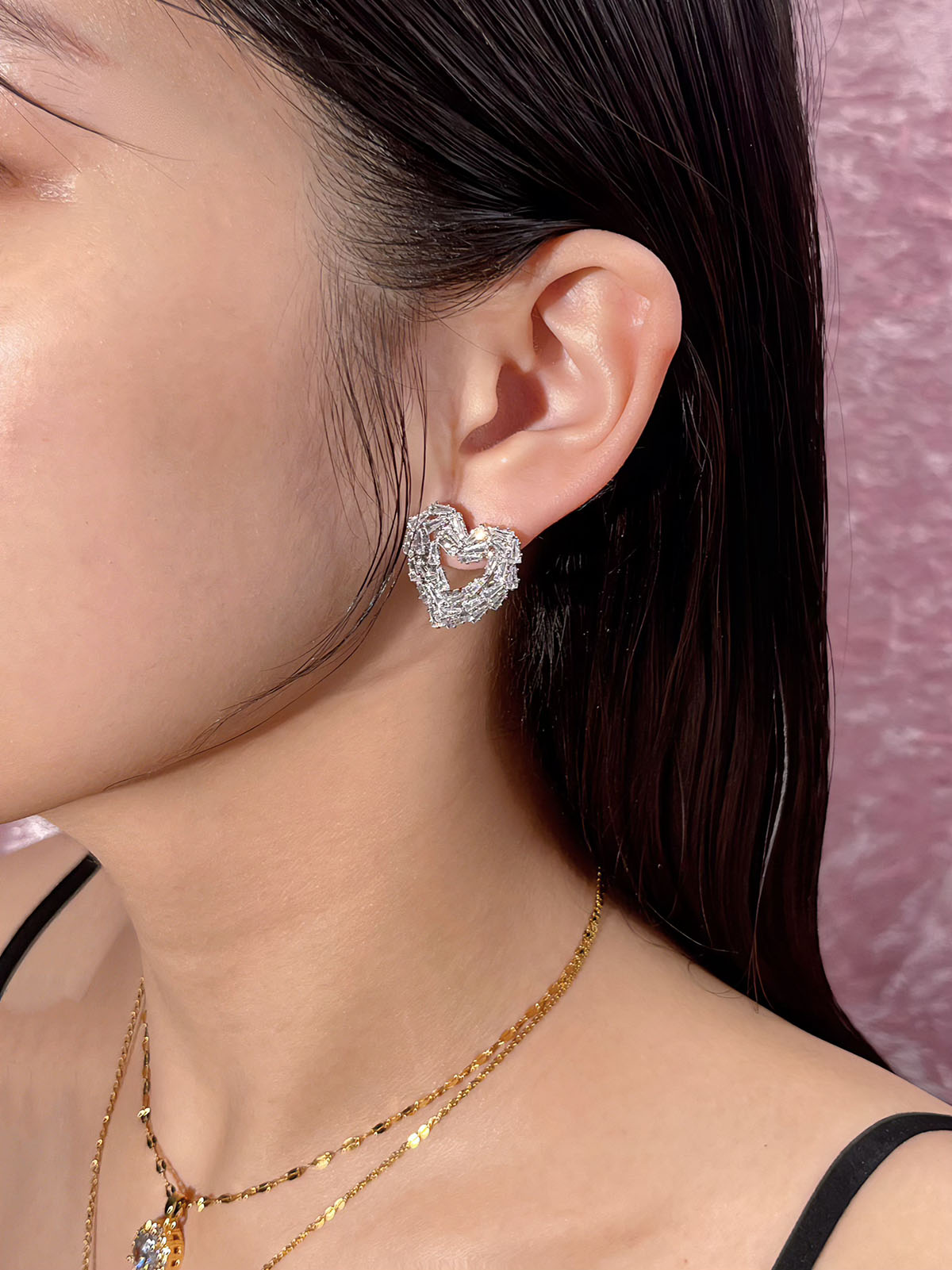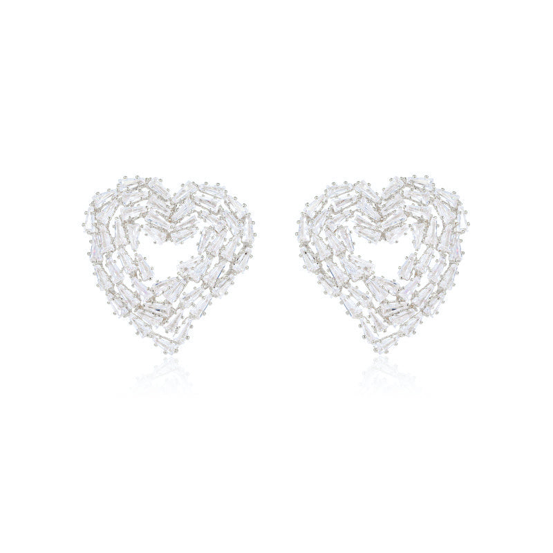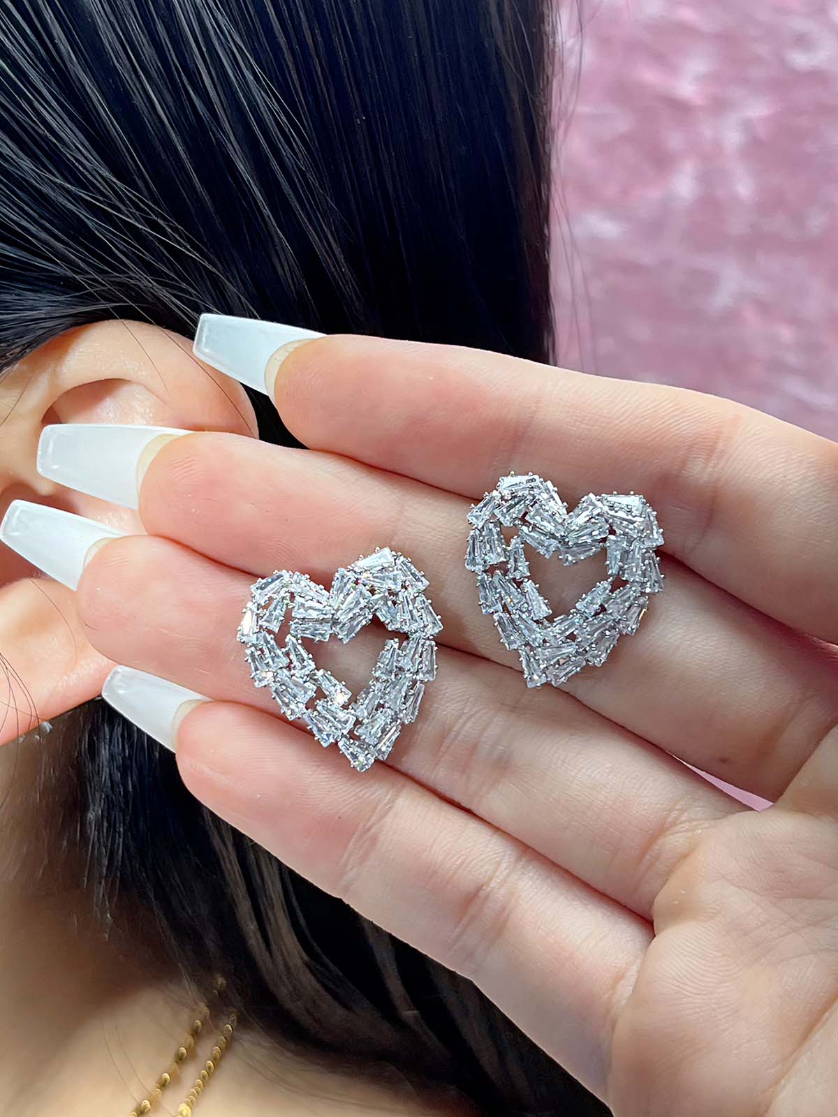 - Shape: The earrings are in the shape of a heart. The entire heart is made of rectangular square diamonds.