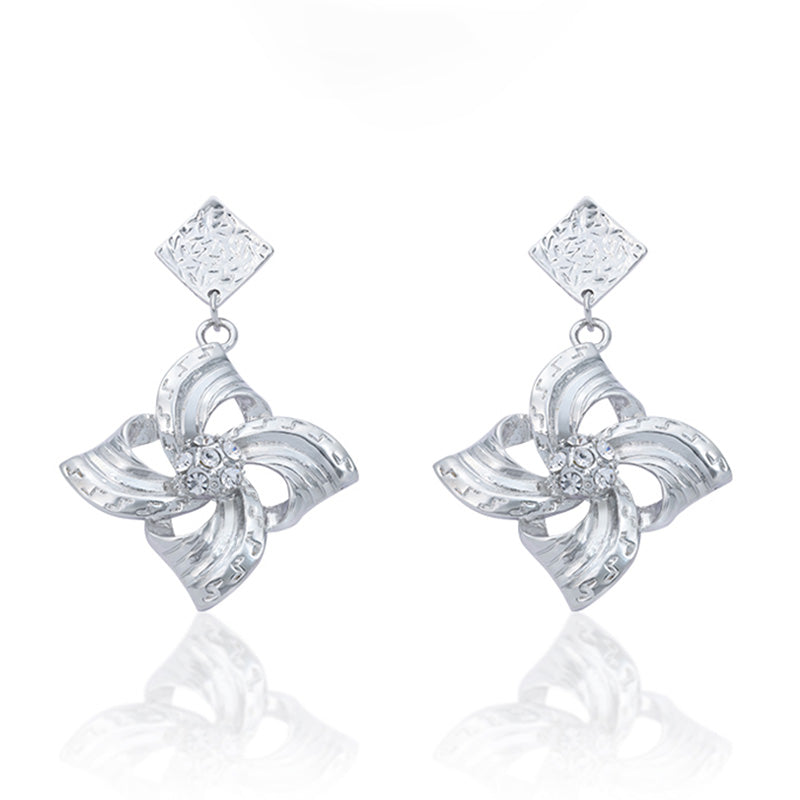Silver Tone Square Baroque Four Leaf Flower Shaped Earrings