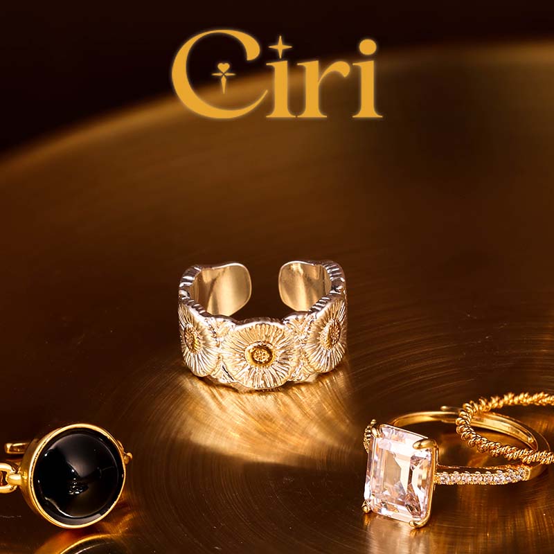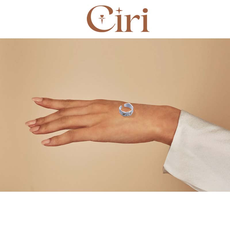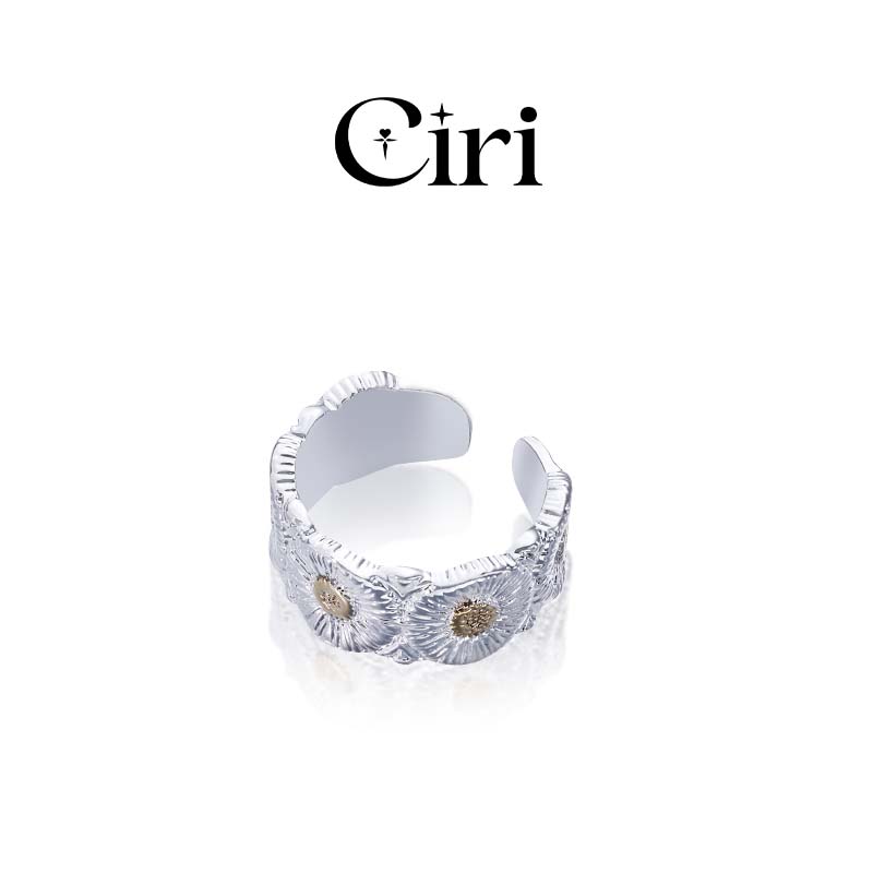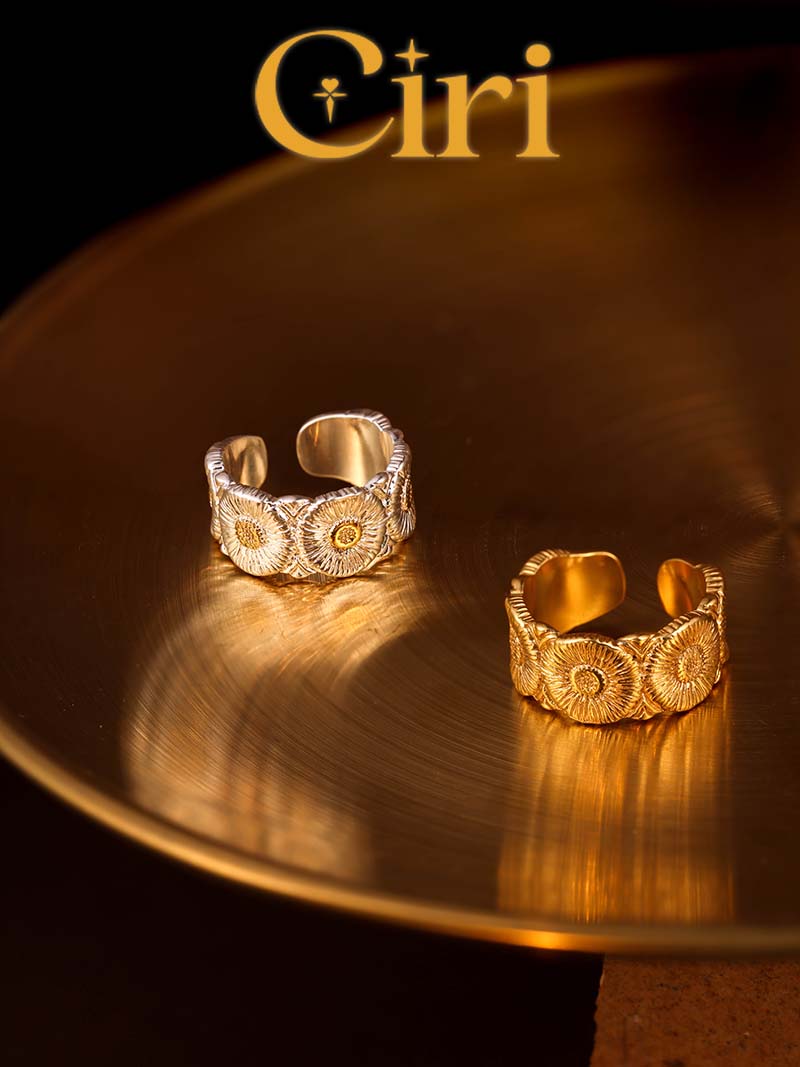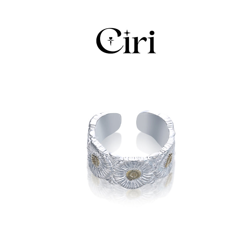 - SHAPE: This is a sliver-colored floral design ring with daisy pattern. The floral pattern repeats and the edges are wavy. The flowers have a raised center and a textured surface.