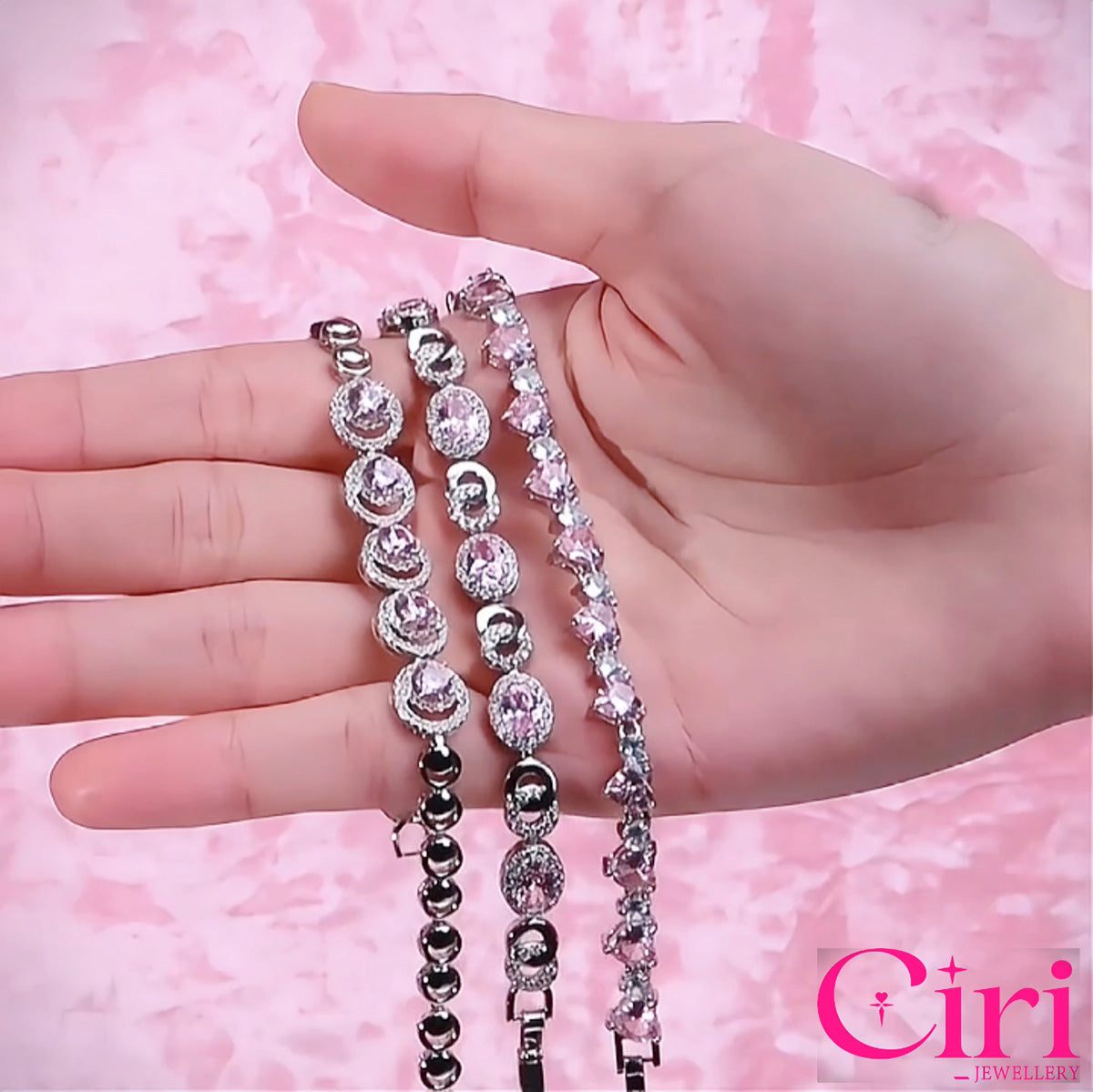 - Shape: The bracelet is composed of oval pink zirconia gemstones. Each pink zircon is surrounded by a circle of small diamonds, and each pink zircon is composed of 2 circles. length of 17cm + 3cm extension chain.